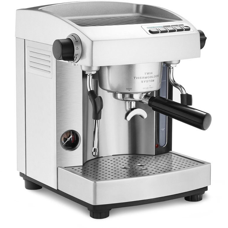 Espressomaskinen är utrustad med två kokare, vilket innebär att den kan brygga espresso och skummjölk samtidigt. Dessutom med två pumpar - en som genererar 15 bar tryck för espresso och den andra 4 bar för ånga, med två munstycken roterade 360 ° och ett professionellt portfilter med en filterdiameter Ppå58 mm.