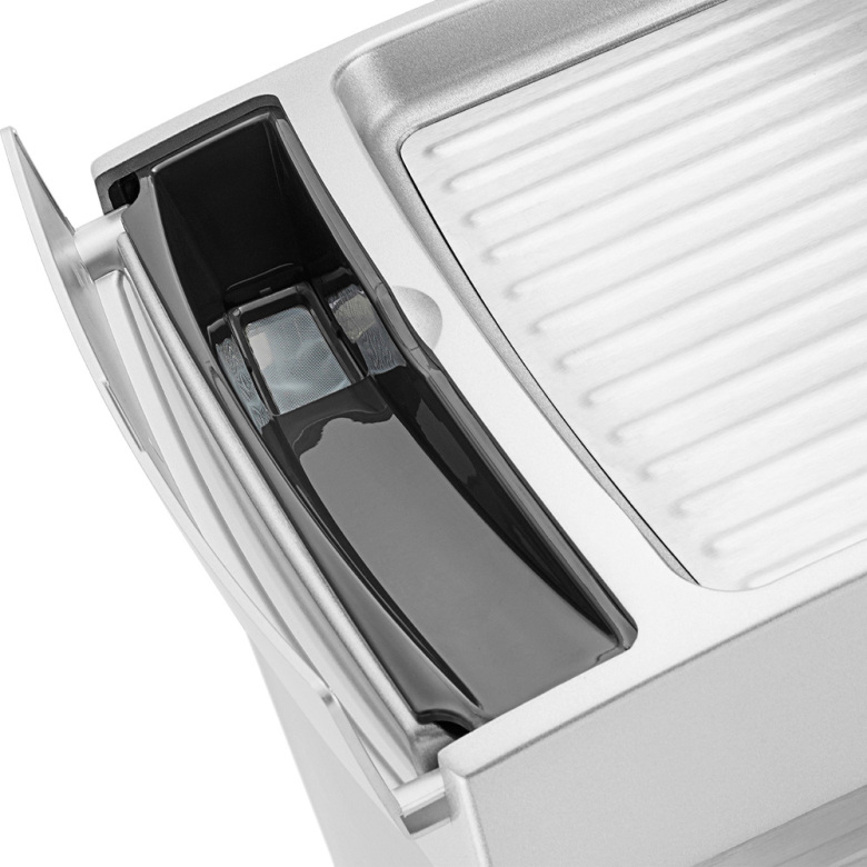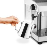 Extraktionstiden kan ställas in antingen manuellt eller automatiskt. Espressomaskinen tar automatiskt hand om att tömma överflödigt vatten från värmesystemet innan ångtillförseln aktiveras och därigenom rengörs den sig själv varje gång den tas i drift. En effekt på 2 400-2 800 W garanterar en riktigt snabb uppvärmning, och när den inte körs växlar den till ett energisparläge. Espressomaskinens ovansida tjänar till att värma upp koppar för att göra kaffeupplevelsen ännu bättre.