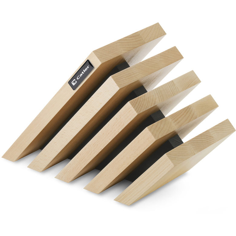 Den genomtänkta formen är kompakt medan den bekvämt rymmer 10 knivar. Den är gjord av bokträ av högsta kvalitet och innehåller en stark magnet och håller även stora knivar på plats.