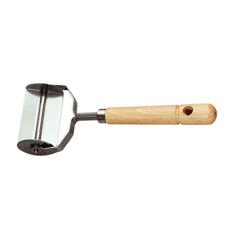Pastaskärare 6 x 6 cm rak kant. Skapar rutor av pastadegen eller kakdegen när man rollar över den. Av rostfritt stål och bok.