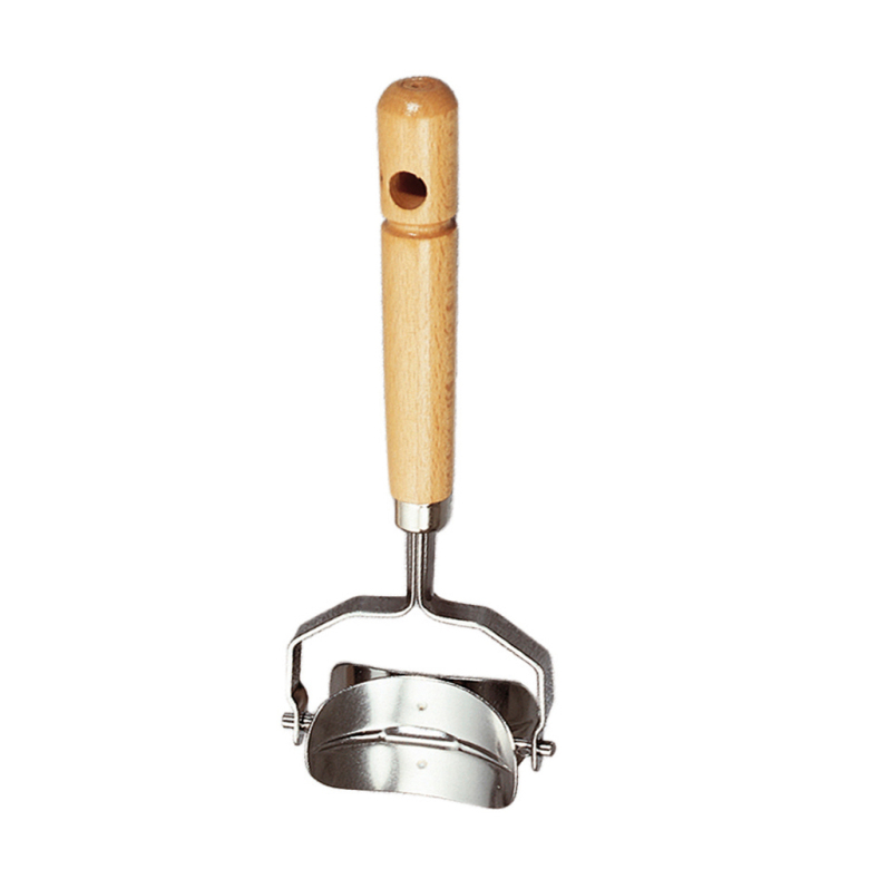 Pastaskärare Stor oval. Skapar runda pastaplattor eller kakor när man rollar över degen. Av rostfritt stål och bok.