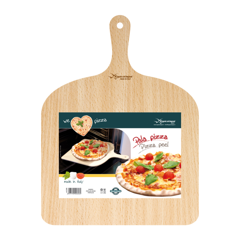 Pizzaspade i björkträ. 41 x 30 cm med fasad kant. Hål i handtaget för eventuell upphängning.