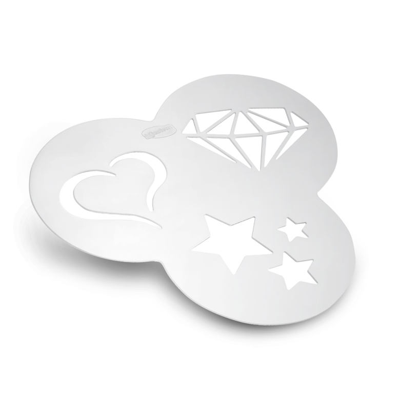 Decoratutto ''I Genietti'' Den professionella stencilen i rostfritt stål för cappuccinokonst med 3 mönster (diamant, hjärta, stjärnor) Även för att dekorera tårtor med vaniljsocker, kakaopulver, malda kryddor. Kan diskas i diskmaskin. Rostfritt stål.