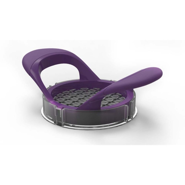 Skala löken och lägg den på brickan. Pressa hackaren med båda händerna över löken så att knivarna skär igenom löken och ända ner i spåren på brickan.