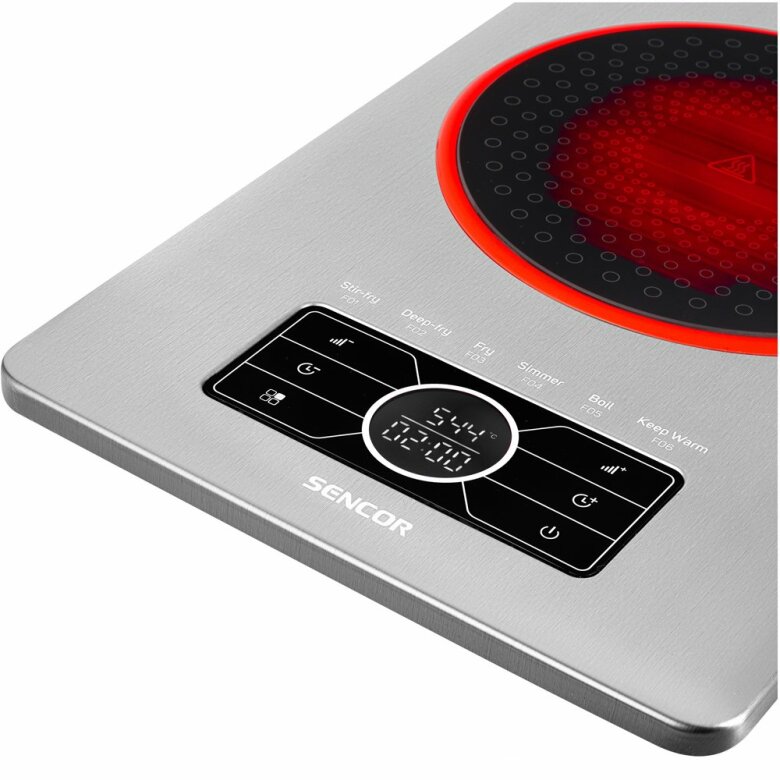 Denna kokplatta från Sencor med SuperConductor-teknologi erbjuder många fördelar tack vare dess keramiska värmeelement. Denna teknik gör att plattan kan ha en extremt låg höjd ? endast 2,5 cm utan fötter och 3 cm totalt med fötter. Snabb och effektiv uppvärmning. Tack vare batteriet av keramiska värmeelement under plattan når den 500\u8239.000000°C på bara 1 minut, och maximalt 600\u8239.000000°C efter 2 minuter. Värmen fördelas jämnt över hela ytan, vilket ger en konstant temperatur under hela tillagningen. Det liknar hastigheten hos induktionshällar, men utan deras nackdel: "Du behöver inte specialkärl" ? denna platta fungerar med glas, aluminium, och traditionella grytor och pannor. Snygg och genomtänkt design. Designen är stilren och passar i alla moderna kök. En smart funktion är den färgade ringen runt plattan som lyser upp när ytan är över 65\u8239.000000°C ? en tydlig varning för att undvika brännskador. Ytan i rostfritt stål är lätt att rengöra, och tack vare de kompakta måtten är den perfekt att ta med till sommarstugan. Tyst drift. Till skillnad från många induktionshällar är denna kokplatta - mycket tyst - . Trots att den behöver aktiv kylning på grund av sin höga effekt, har den utformats med låg ljudnivå som prioritet. 6 Förinställda tillagningslägen: Välj enkelt rätt matlagningsläge med ett knapptryck. Du kan även justera både tillagningstid och effekt manuellt. Wok. Snabb tillagning i mycket het olja, typiskt för asiatisk matlagning. Upp till 600\u8239.000000°C. Plattan håller hög effekt hela tiden. Fritera. Maten tillagas i ett oljebad för jämn och snabb tillagning. Exempelvis rapsolja med hög rökpunkt rekommenderas. - Full effekt i 1 minut - 900 W i 7 minuter - Därefter 750 W till slut Steka. Lämpligt för att steka kött eller grönsaker. - Full effekt i 1 minut (upp till 380\u8239.000000°C) - 900 W i 7 minuter - Därefter 750 W till slut Sjuda. Långsam tillagning i låg temperatur ? t.ex. för grytor eller såser. - Full effekt i 15 minuter - Därefter halverad effekt Koka upp. Perfekt för att koka vatten till pasta m.m. - Håller maximal effekt i 30 minuter eller tills du stänger av Varmahållning. Håller maten varm på ca 150\u8239.000000°C. - Startar på 300 W i 1 minut - Därefter håller den temperaturen med 150 W Funktioner och Fördelar. - Enkelsplatta med 1500 W effekt - SuperConductor-teknik med keramiska värmeelement - Varningsring som lyser vid het yta - Extremt låg höjd ? endast 3 cm inklusive fötter - Värmeplattans diameter: 19 cm - Passar kokkärl upp till 28 cm - Effekten justerbar i steg om 100 W - Slät, lättstädad yta - 6 tillagningslägen - Timer upp till 4 timmar - Portabel ? perfekt för sommarstugan eller mindre kök Teknisk specifikation: Effekt: 1500 W Justering: 100 W-steg Max. temperatur: 690 °C Timer: Ja Sladdlängd: 120 cm Mått:36 × 25 × 3 cm Vikt: 2,7 kg Färg: Rostfritt stål