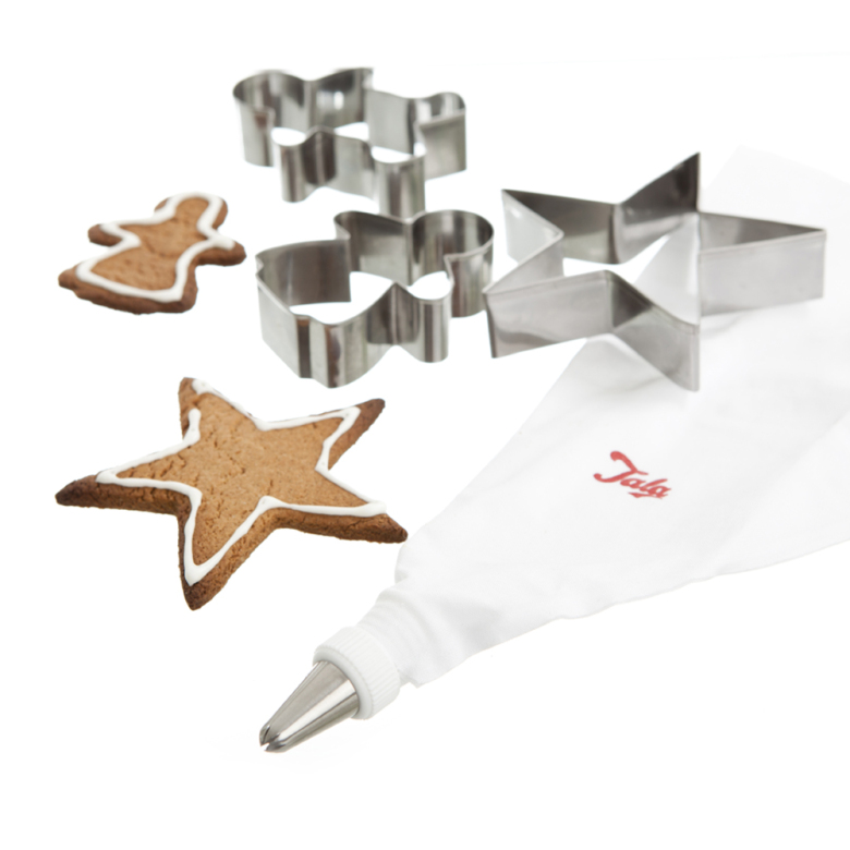 Ett set med Pepparkaksformar, spritspåse och en tyll